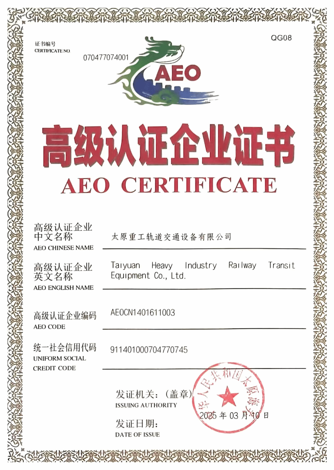國(guó)際化是太重建設(shè)一流企業(yè)的必由之路,更是實(shí)現(xiàn)基業(yè)長(zhǎng)青的戰(zhàn)略選擇。近日,太重軌道公司成功通過(guò)海關(guān)AEO(Authorized Economic Operator)高級(jí)認(rèn)證復(fù)審,斬獲國(guó)際貿(mào)易通關(guān)“金字招牌”,躋身國(guó)內(nèi)少數(shù)獲此資質(zhì)的軌道交通企業(yè)行列。